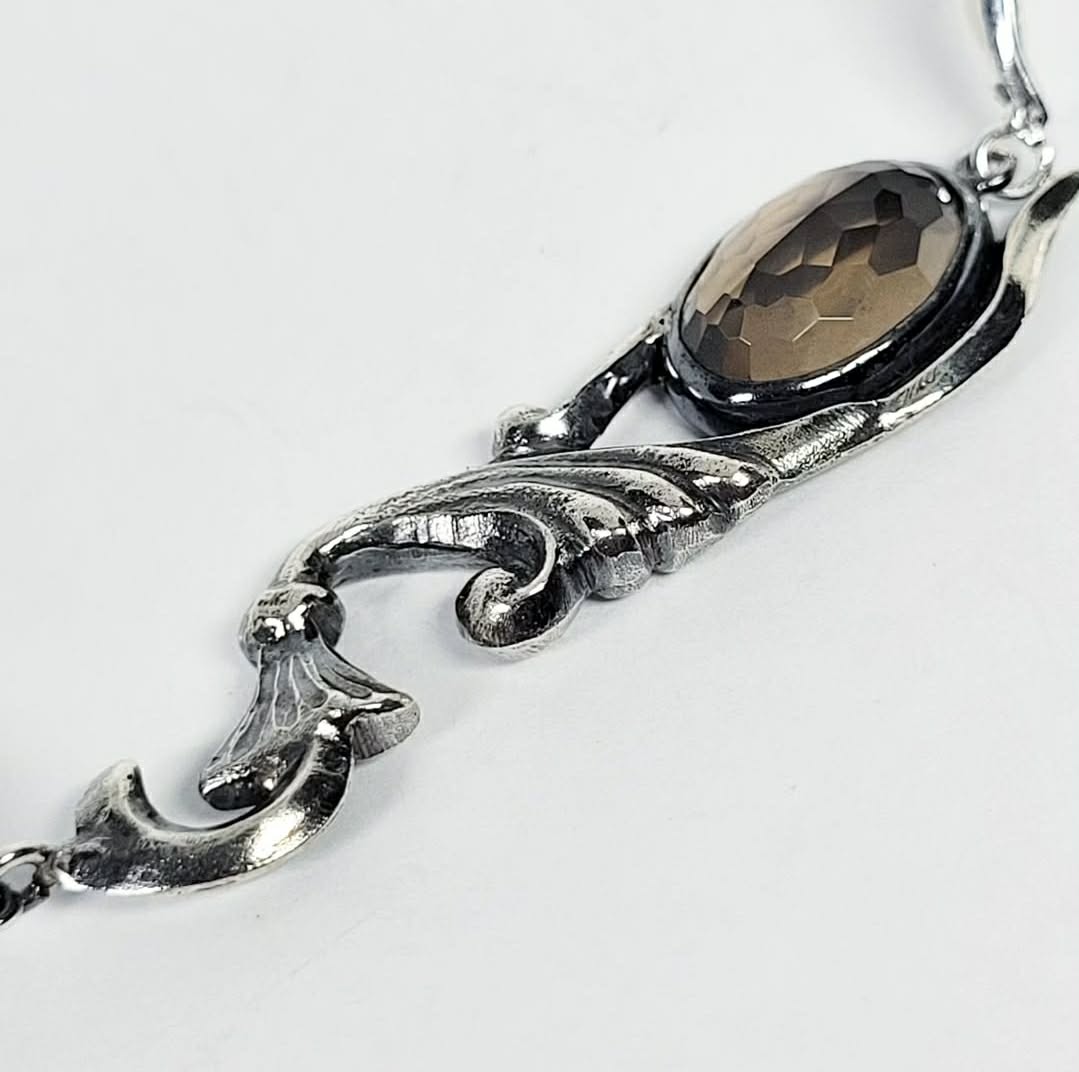 Sterling silver sand cast stud earrings using components moulded from antique silver serving ware. Smoky quartz and labradorite were paired to make some dark autumn colours with a flash of iridescent green