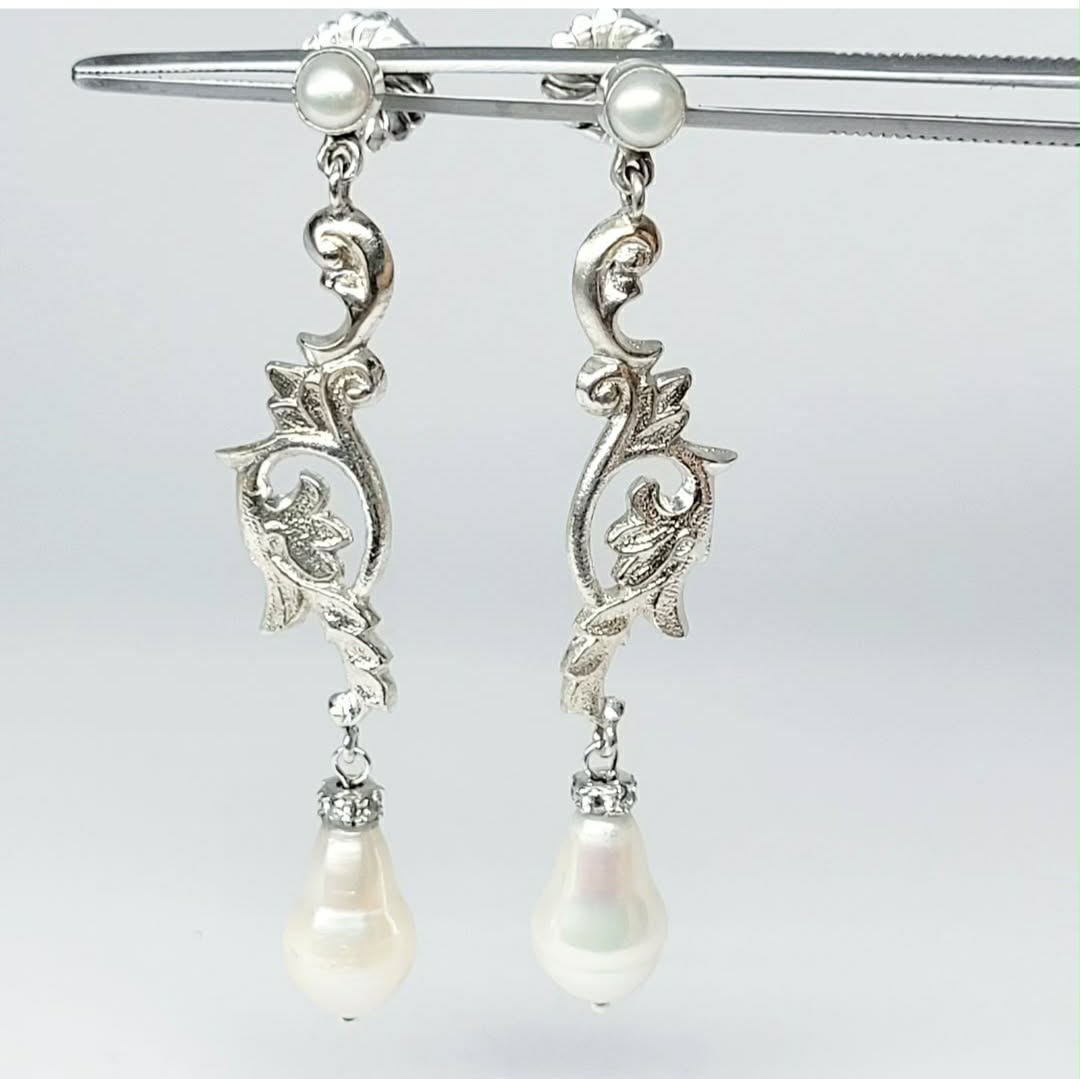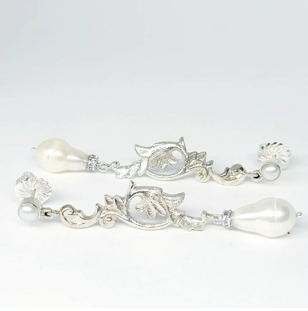 Sterling silver sand cast hook earrings using components moulded from antique silver serving ware. Fresh water pearls added for some soft iridescent glow. Pearl caps are grain set with CZs.